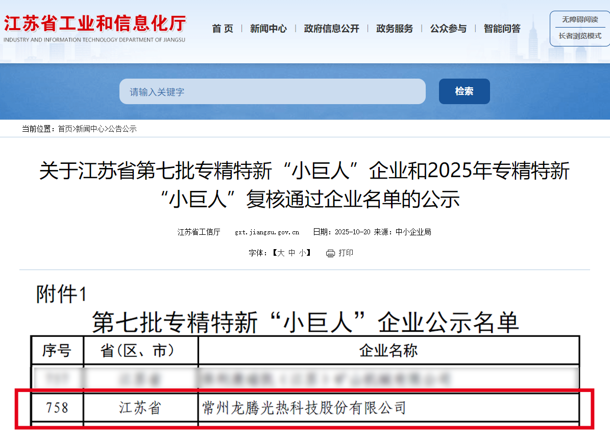 近日,江苏省经济和信息化厅正式公示第七批国家级专精特新 “小巨人” 企业名单,常州龙腾光热科技股份有限公司凭借在光热发电领域深厚的技术积淀与光热核心装备制造领域的领先优势,荣获国家级专精特新 “小巨人” 企业称号。